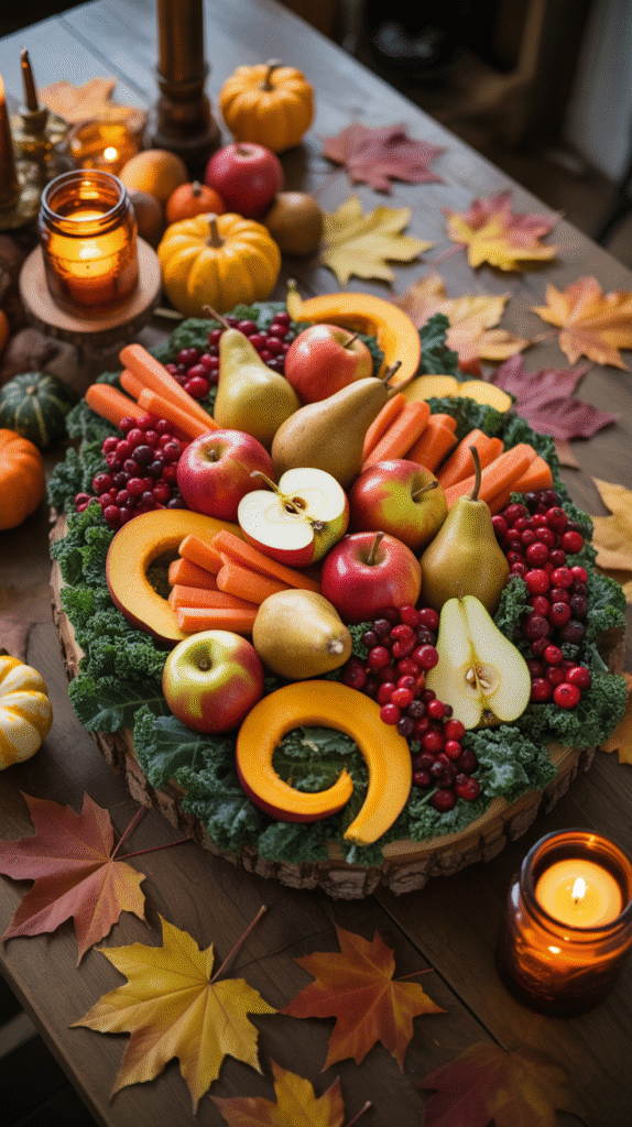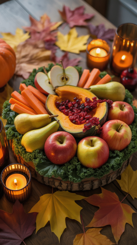 - Use black slate boards, wooden trays, or pumpkin-shaped platters.