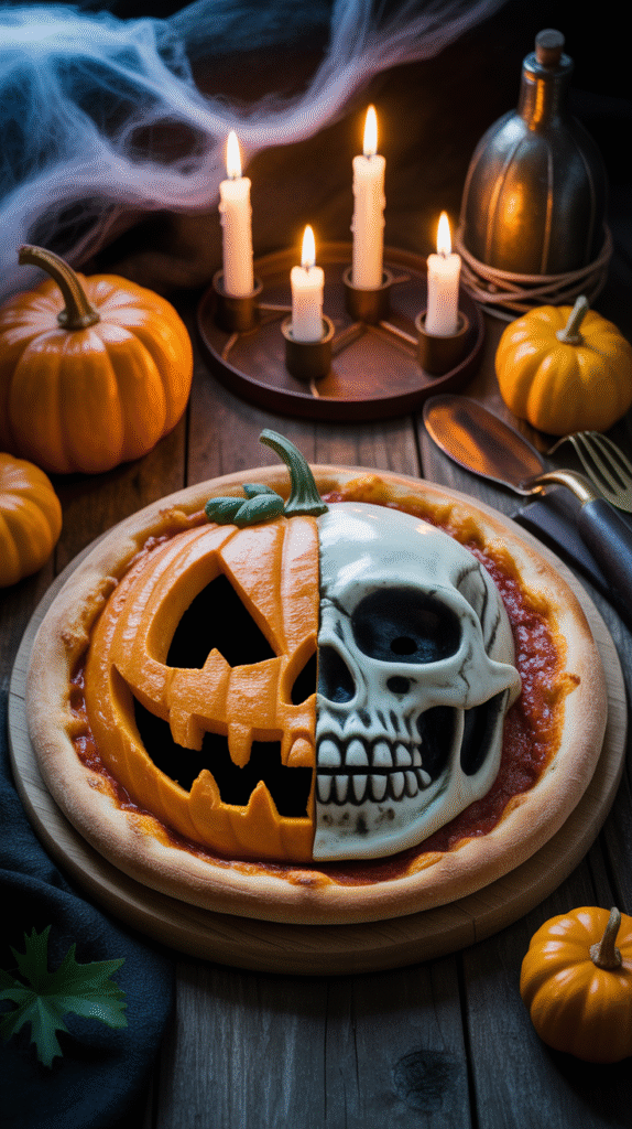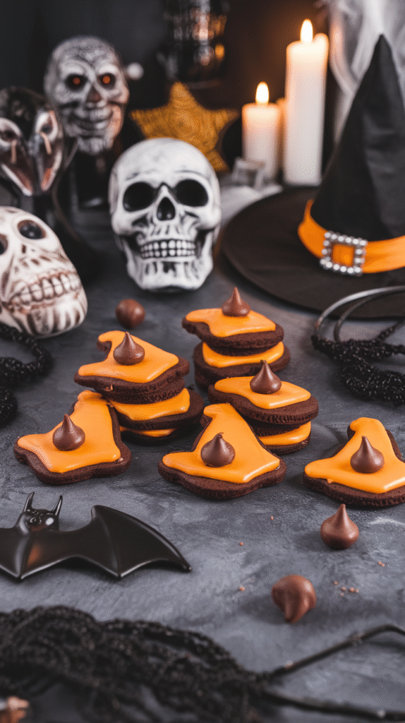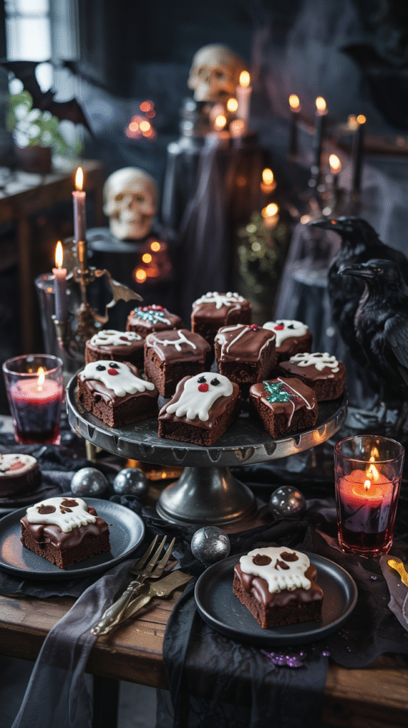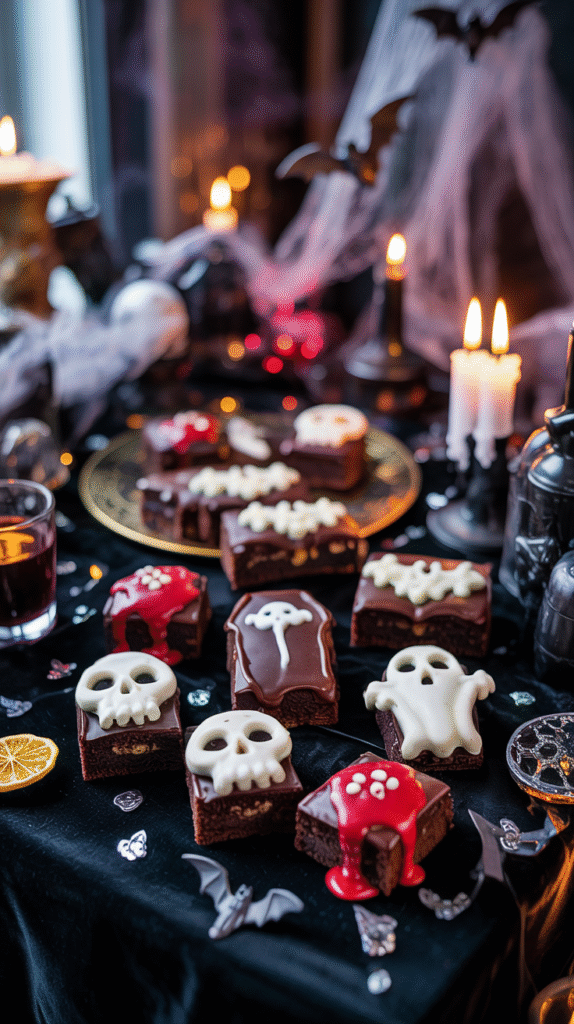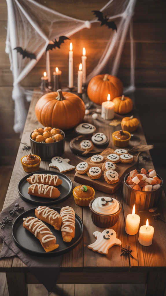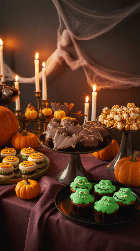 - Add bat garlands, skull candles, and orange napkins.