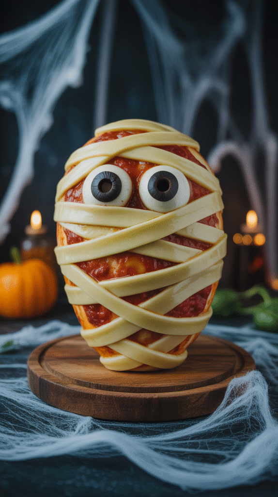 - Add cucumber slices as eyes and olives to form the jack-o’-lantern face.